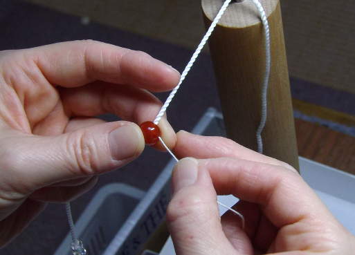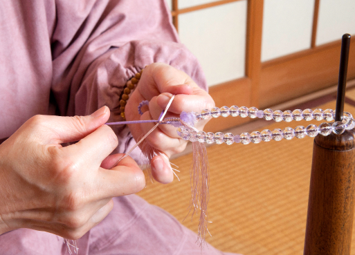 製作には、玉通し、房作り、糸組などの工程にこだわり永年の経験をもとに、一粒一粒微妙な力加減をつけて心のこもった手作りの念珠を製作しています。